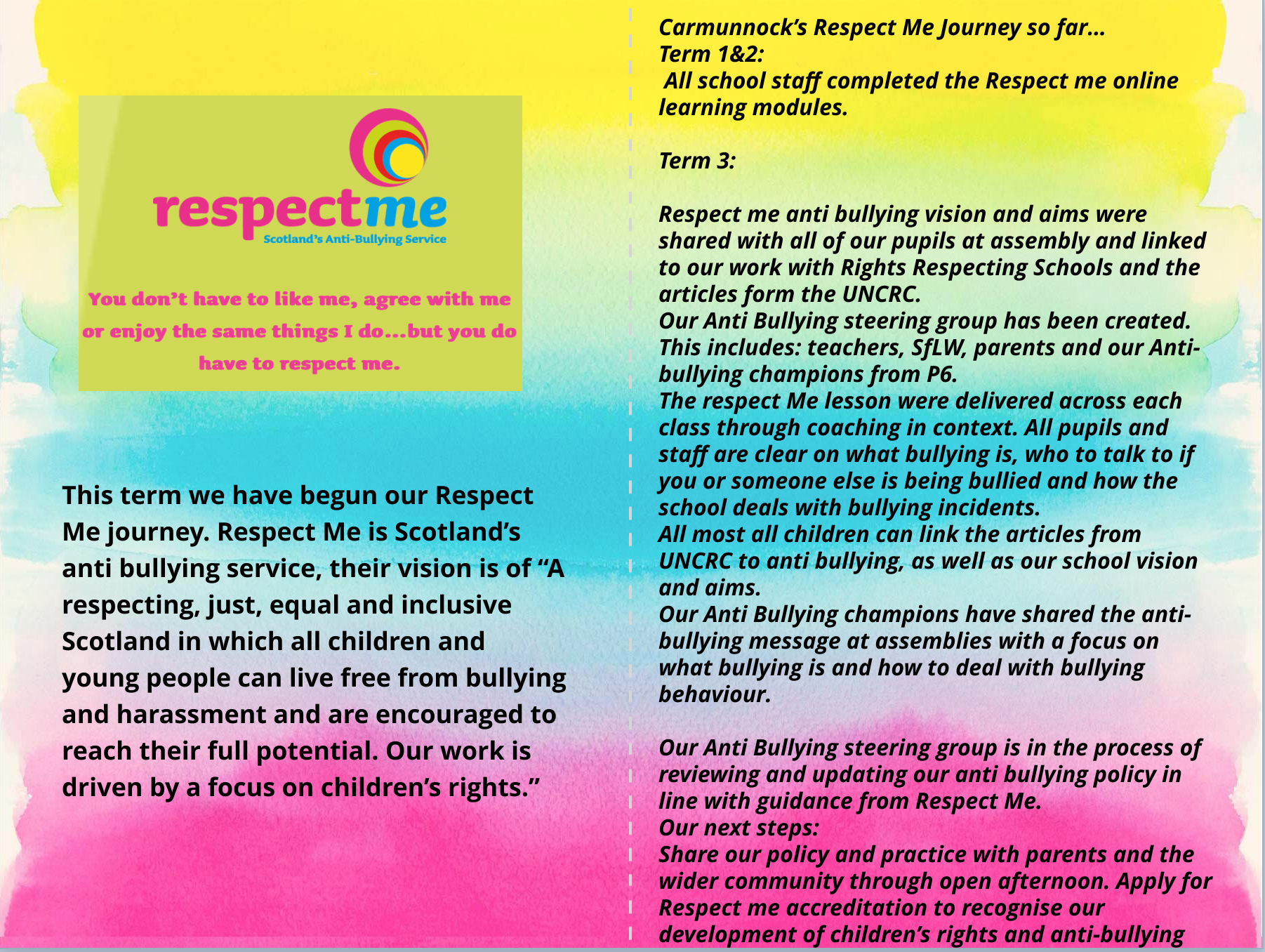 School Information FIle Anti- bullying Respect Me 12.36 MB Anti- bullying Respect Me 22.31 MB Carmunnock Primary Rights Respecting Schools Poster2.07 MB